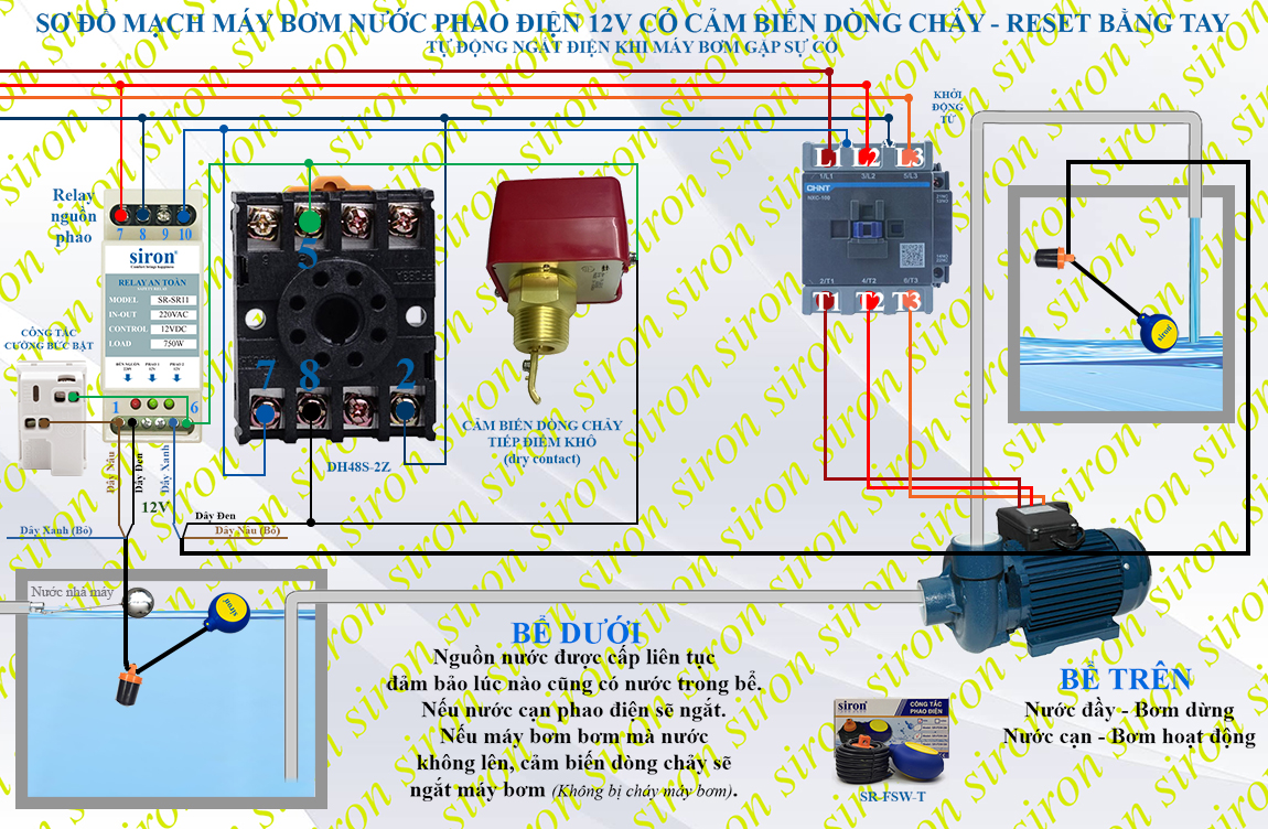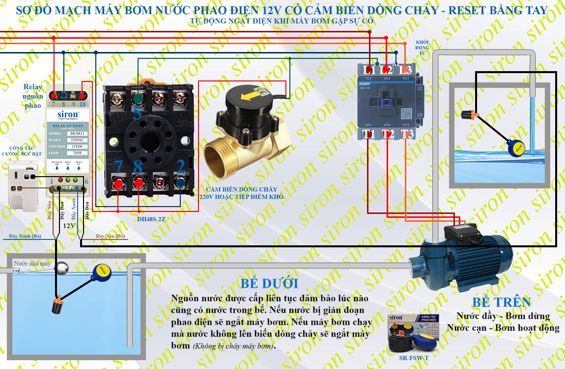 Sơ đồ chống cạn lắp cảm biến dòng chảy chuyển nguồn an toàn phao điện