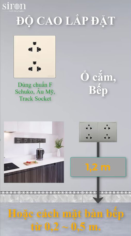 Độ cao lắp đặt ở bếp thường cách mặt bàn 0,3 m. Nếu là Track socket thì nên để cao hơn các thiết bị khác để không bị che lấp khi sử dụng. |
